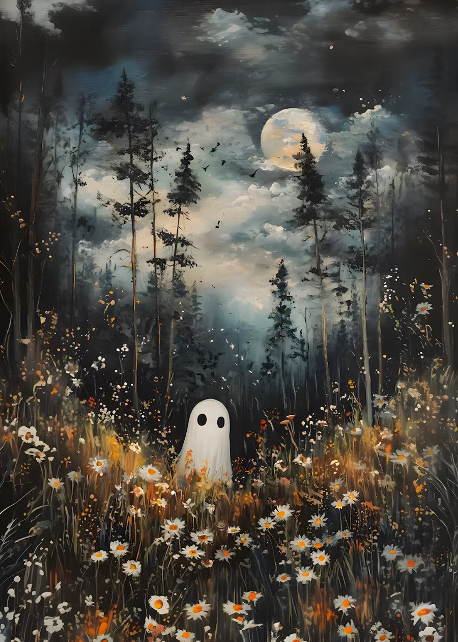 A halloween inspired Dark Academia Vintage Illustration of a cute sheet ghost standing in a field of daisy's surrounded by trees in night.