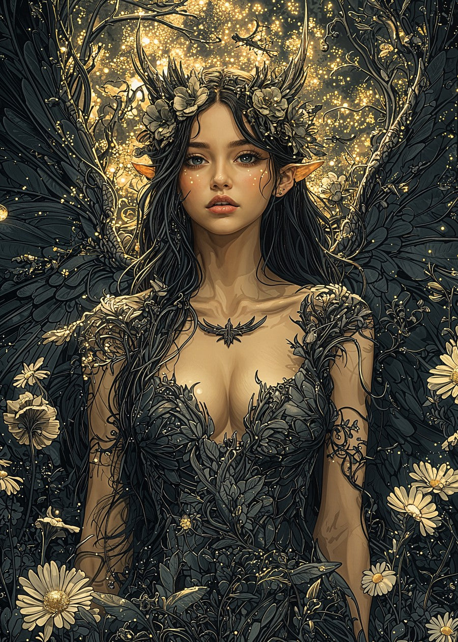 A beautiful woman with long black hair and pointed ears, adorned with a crown of white flowers, stands amidst a field of daisies.