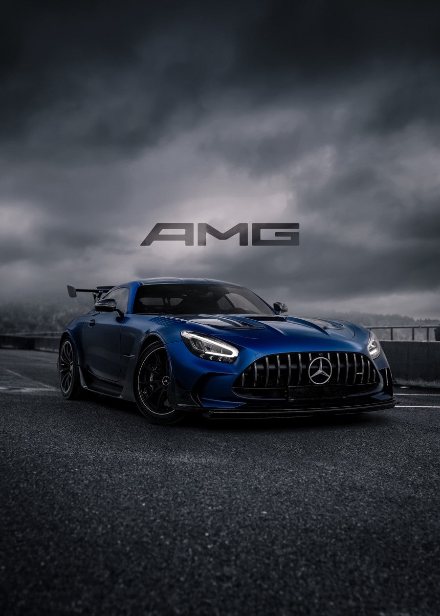 A dark blue Mercedes-AMG GT Black Series sits on a cloudy road, exuding a sense of raw power and performance with its striking front grille.