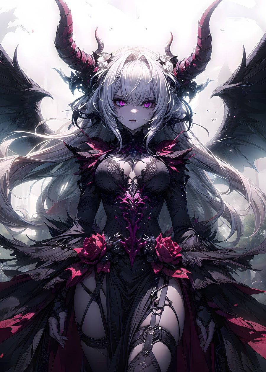 A mysterious figure with wings and horns exudes an ominous yet captivating aura.