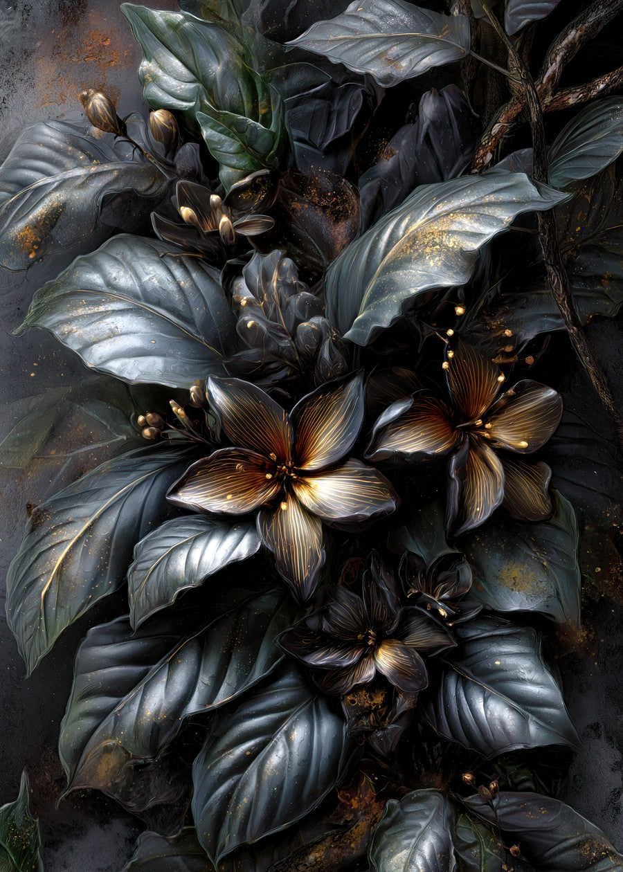 This captivating scene showcases metallic flowers intertwined with lush green leaves, creating an enchanting and dramatic feel.