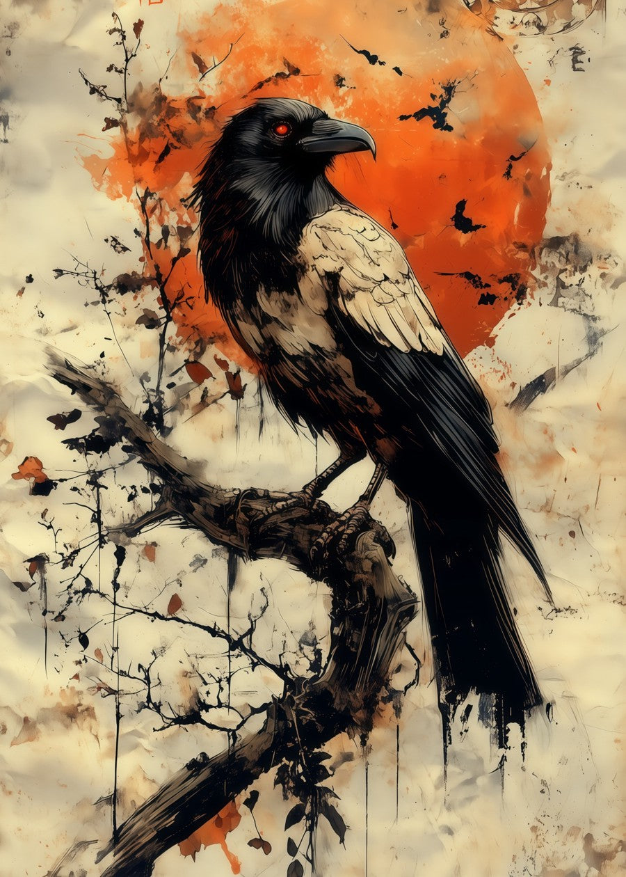 A striking raven with glowing red eyes sits on a branch, set against an intense orange moon. The artwork features occult symbols and a grung.