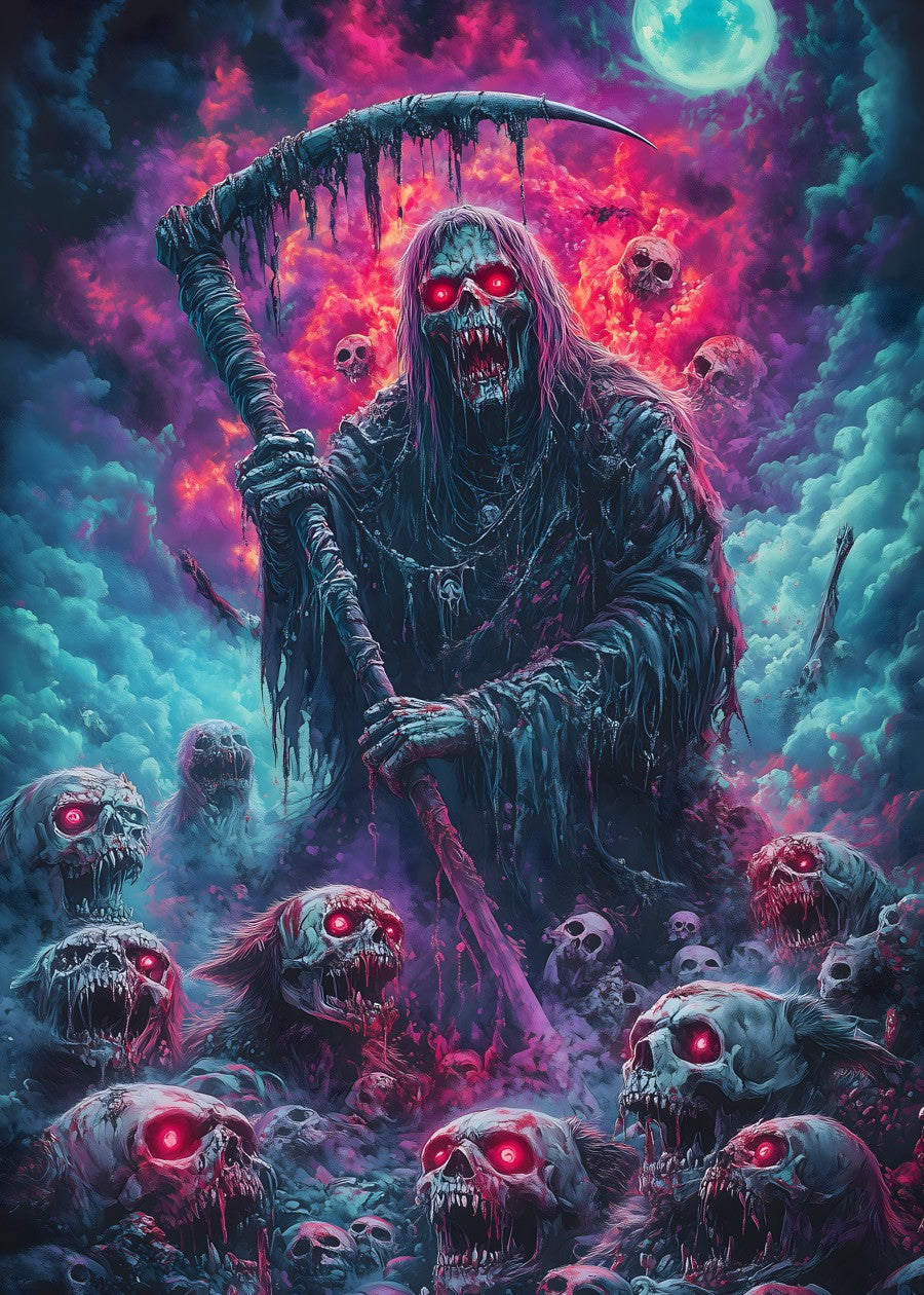 Dark Zombie Grim Reaper with old scythe standing in the middle of Skulls.