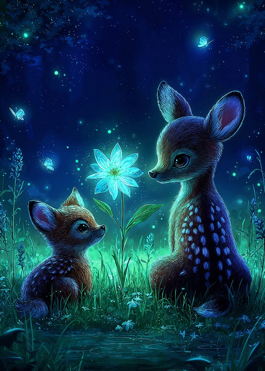 Two glowing deer share a magical moment in the moonlit forest beside a radiant, luminous flower.