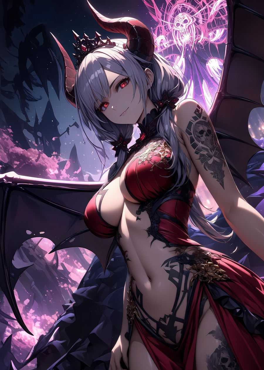 A captivating demoness with mystical wings and a mischievous smile, set against a celestial backdrop.