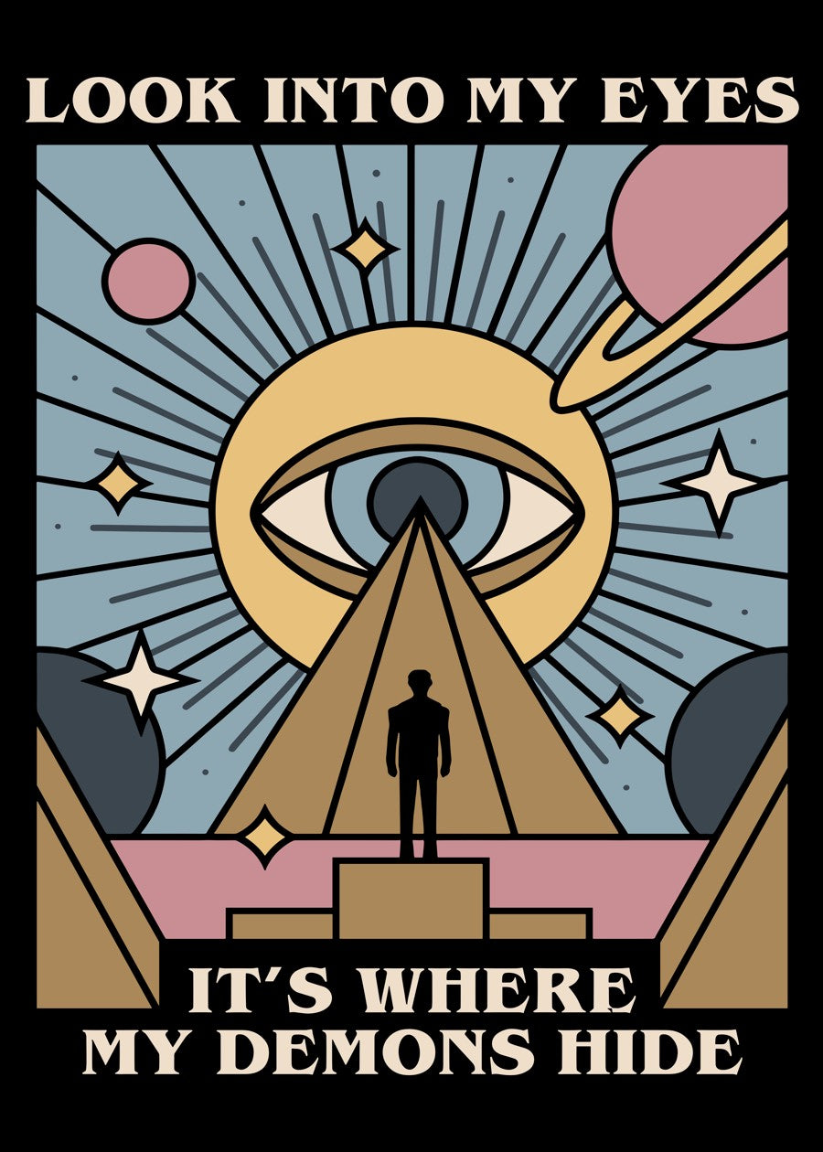 The lyrics "Look into my eyes, it's where my demons hide," with a lone figure standing before a giant eye.