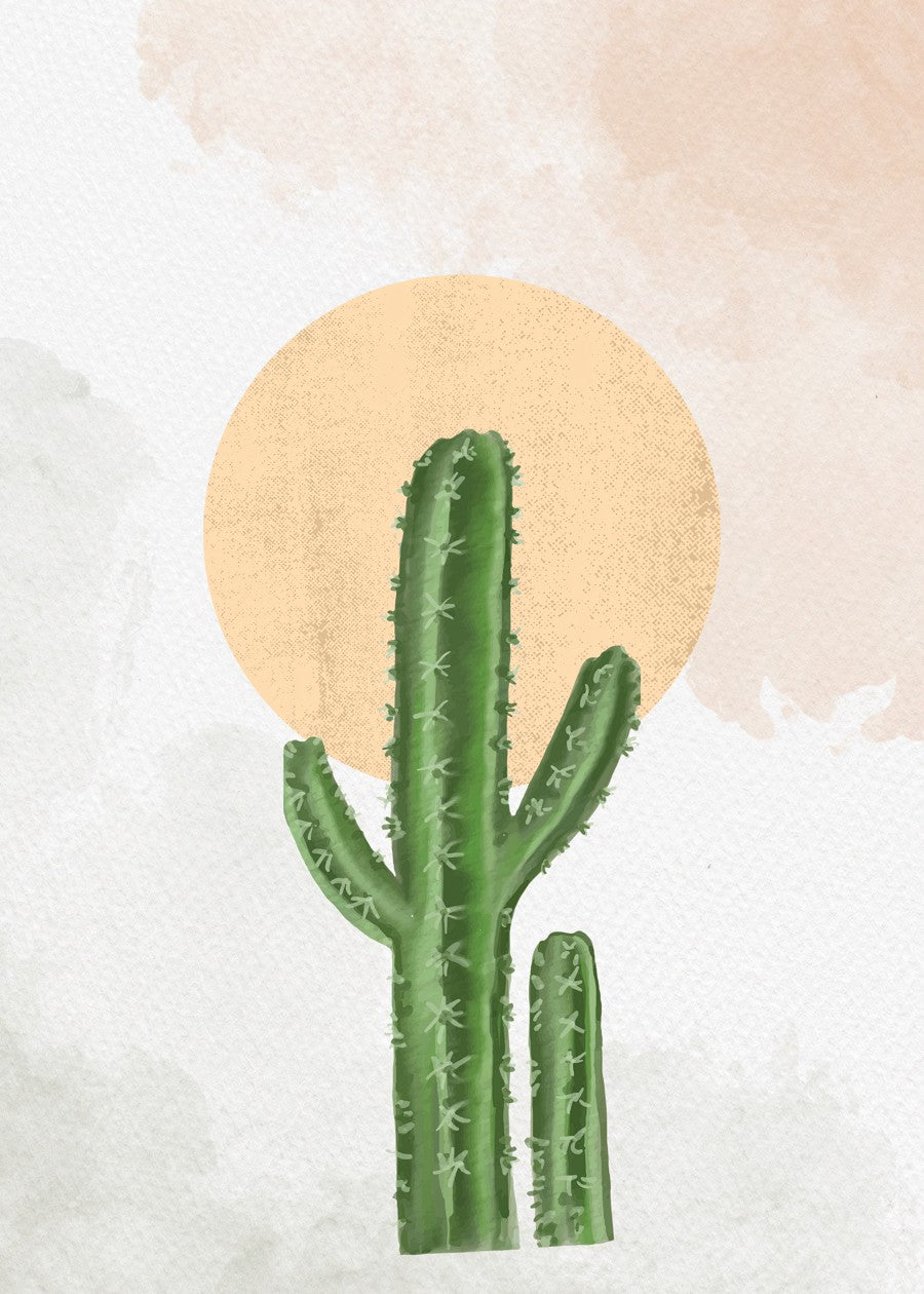 A soft minimalist boho-style artwork featuring a tall green cactus set against a textured watercolor background and a warm beige sun.