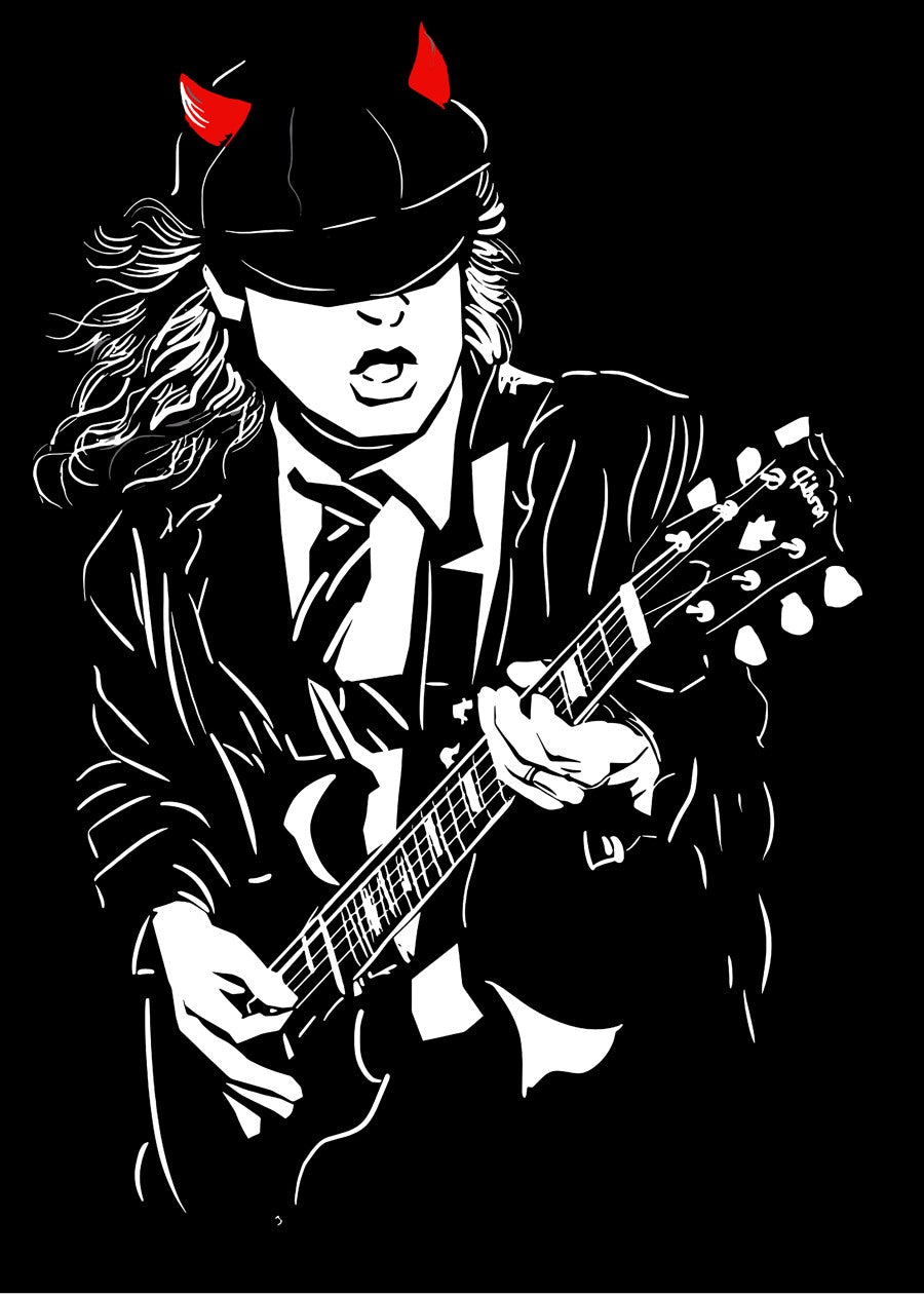 A dynamic black and white artwork depicts a rock guitarist in classic stage attire, wearing a hat with red devil horns.