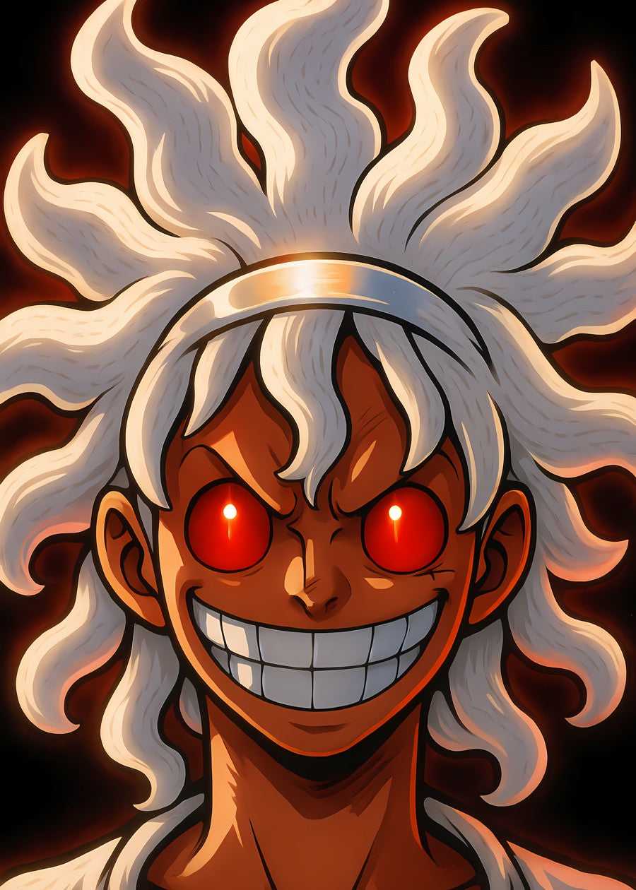 Burning with divine energy, Luffy’s red eyes and radiant grin embody the unstoppable power of the Sun God.