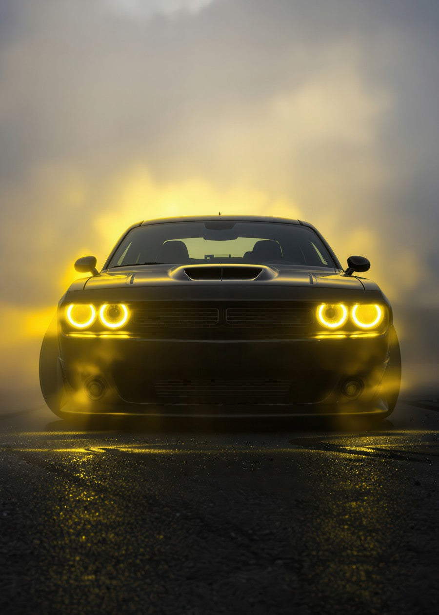 A menacing Dodge Challenger engulfed in mysterious, glowing yellow smoke.
