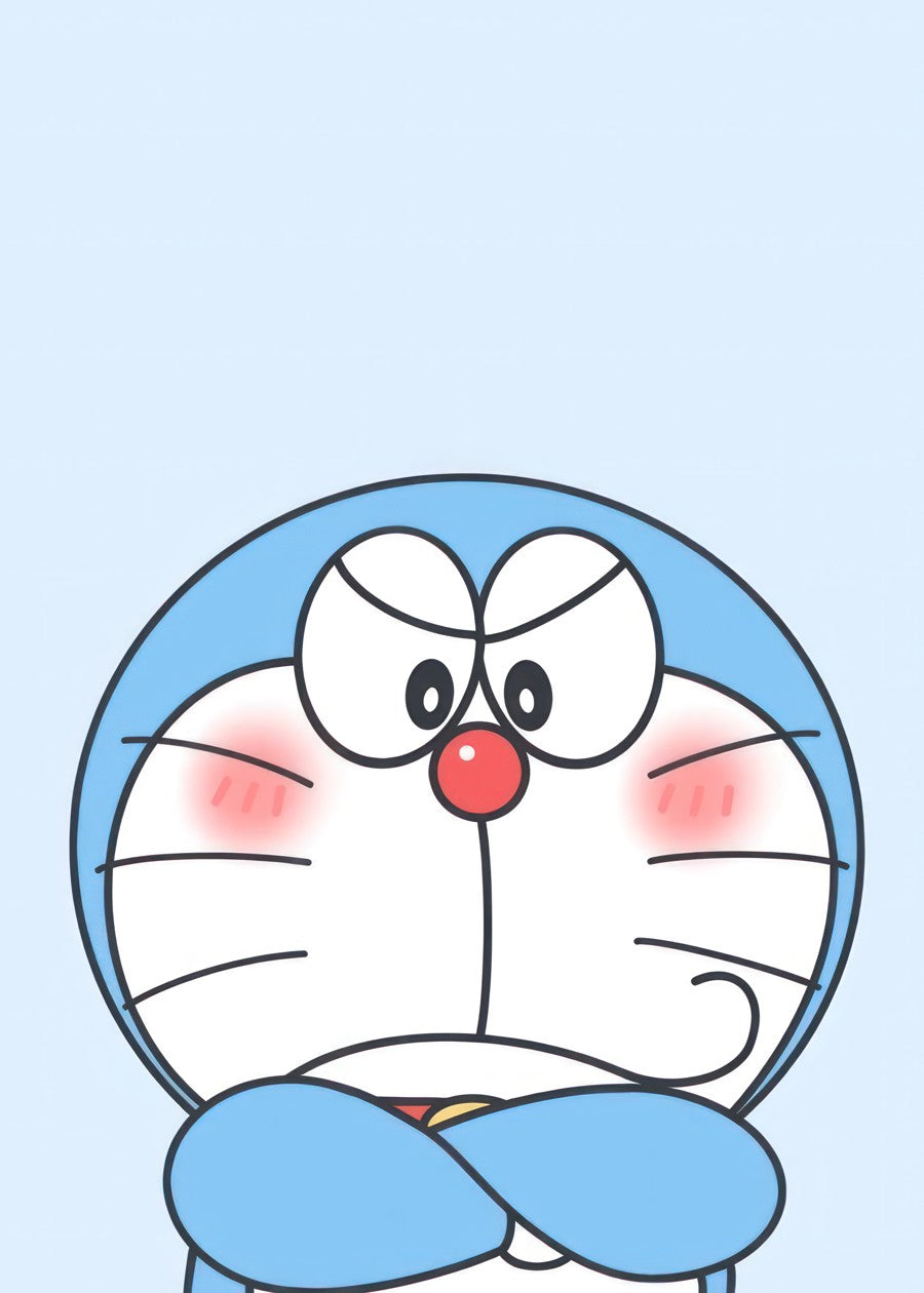 Cute Doraemon with crossed arms and a confident expression on a light blue background