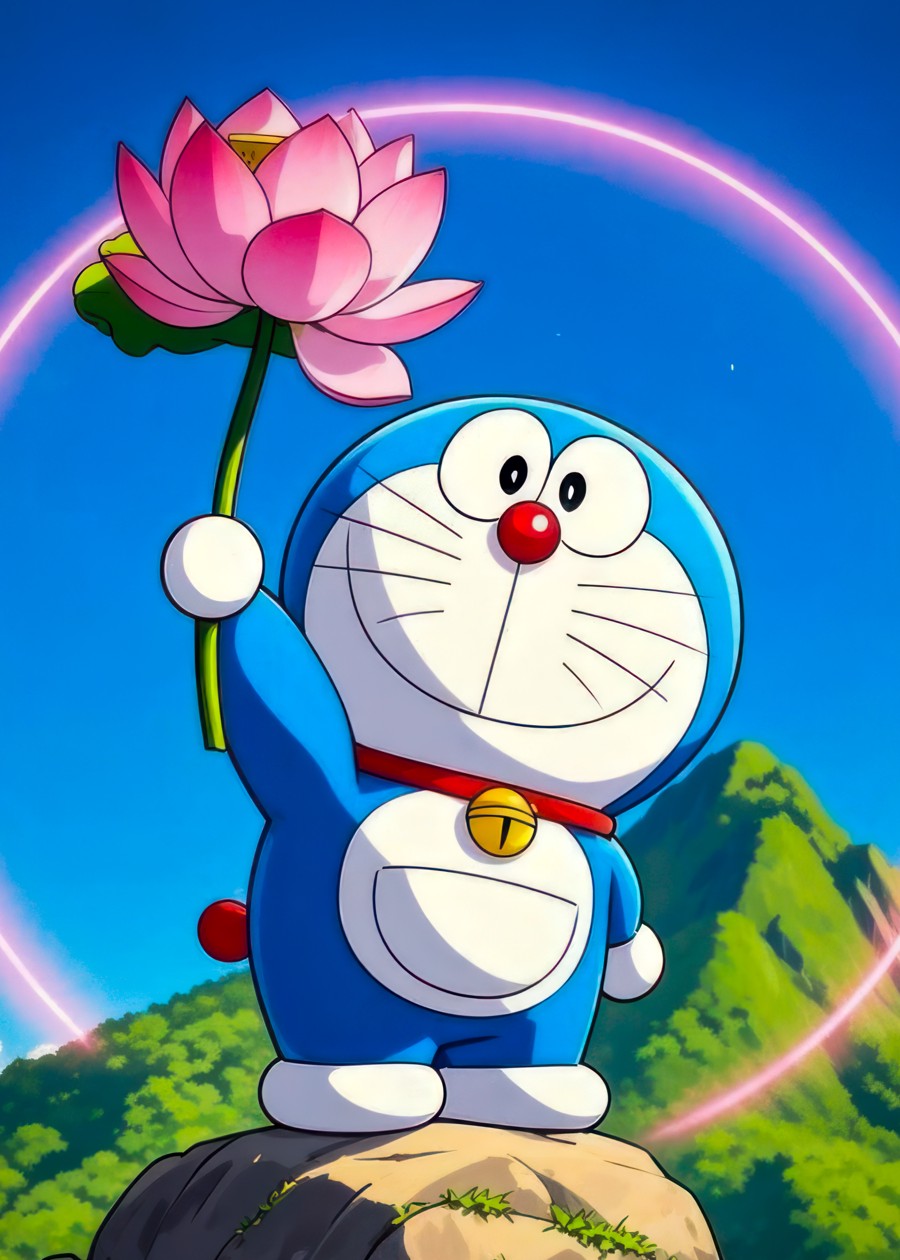 Doraemon proudly holds a lotus flower with nature and mountains behind him.