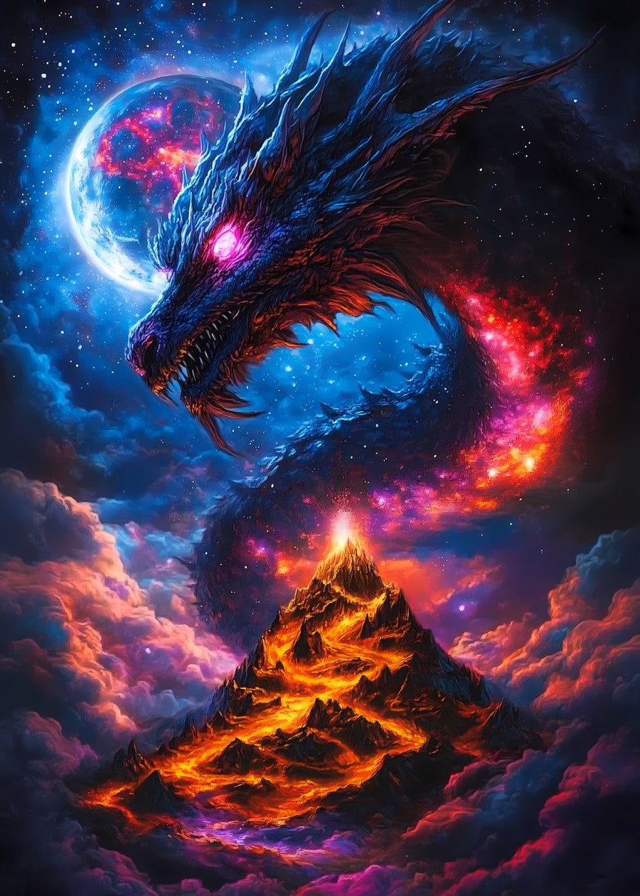A fierce cosmic dragon gazes at a fiery mountain under a starry sky.