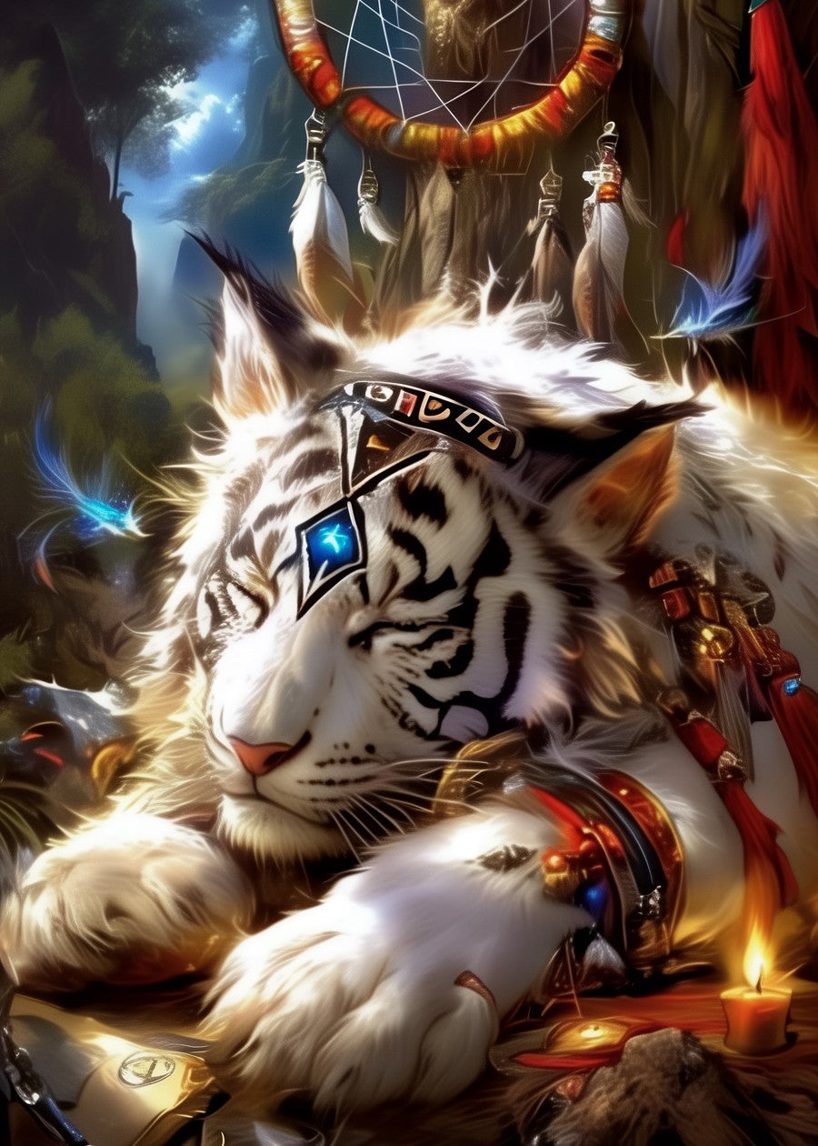 A mystical white tiger adorned with tribal elements rests beneath a dreamcatcher.