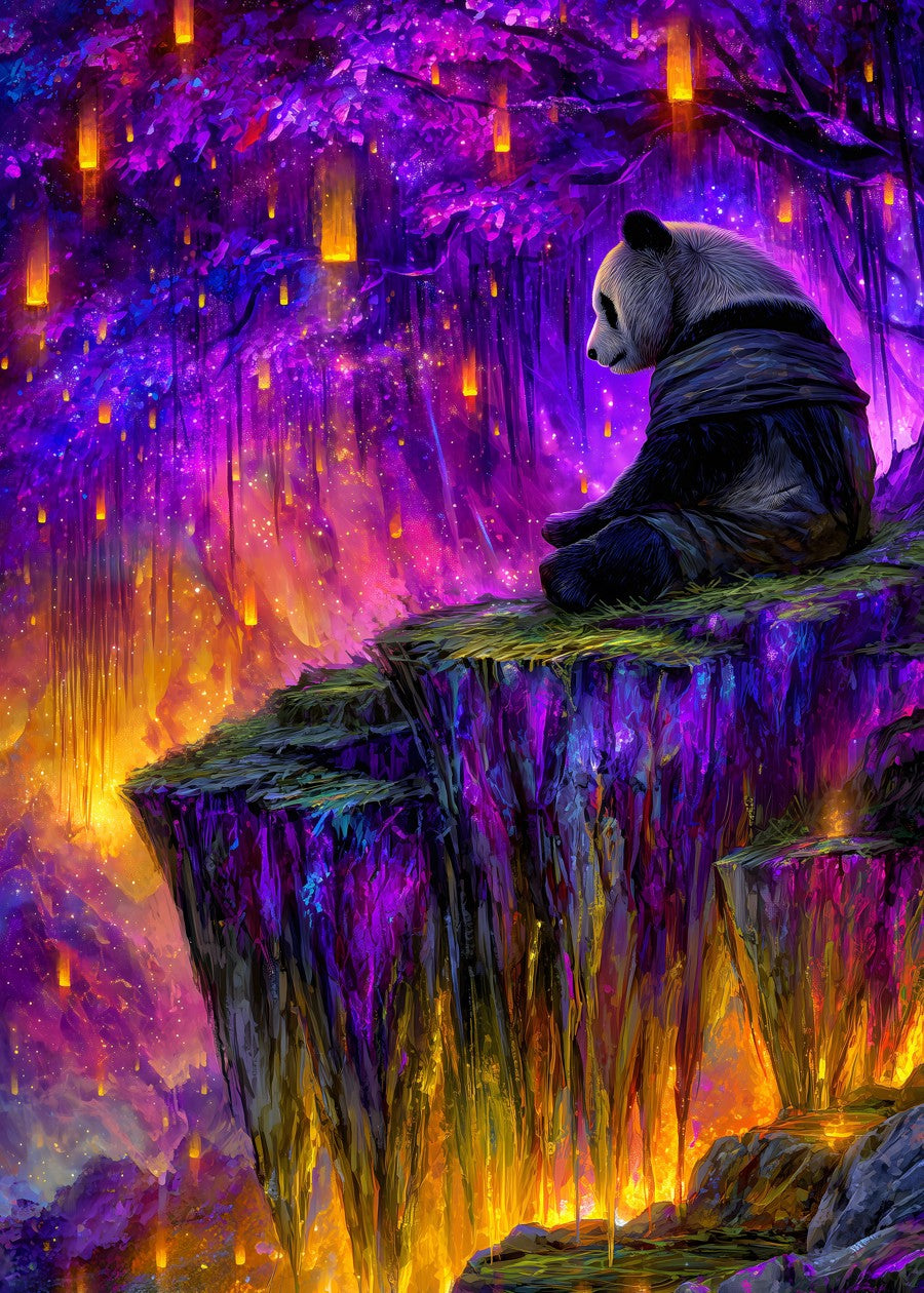 A serene panda gazes into a magical forest alive with glowing lanterns.