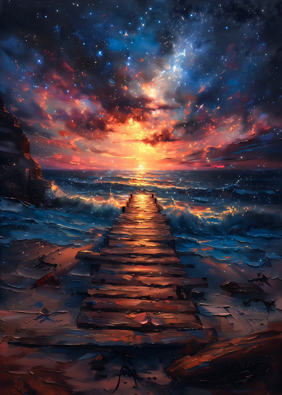 Beautiful Shot of Dreamlike Ocean Landscape with a wooden Bridge.