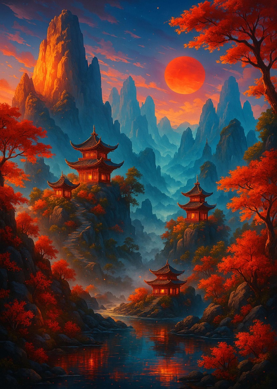 A misty fantasy view of 16th century coastal China, where ancient villages and jade waters meet under soft, painterly skies.