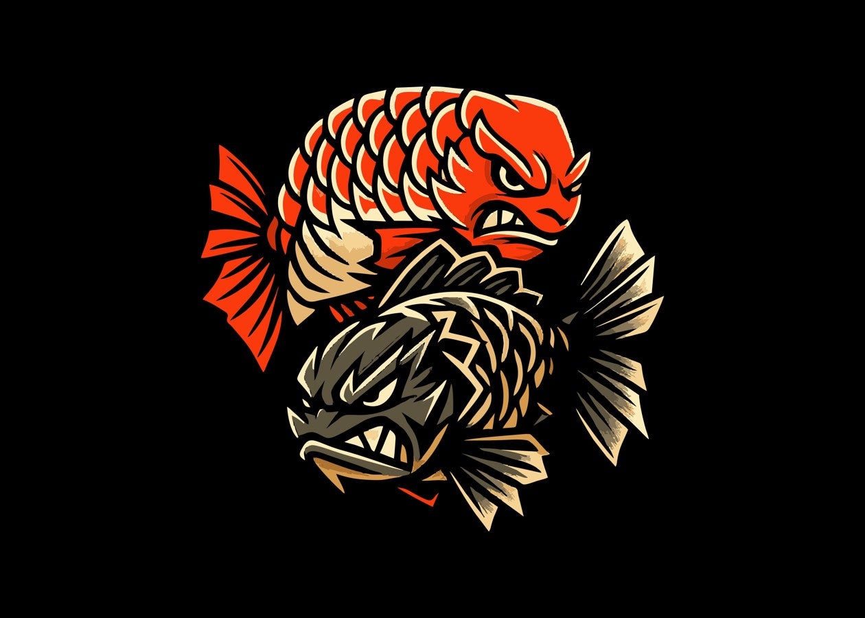 A powerful vector illustration of two bold fish with fierce expressions, sharp details, and striking red and gold tones.
