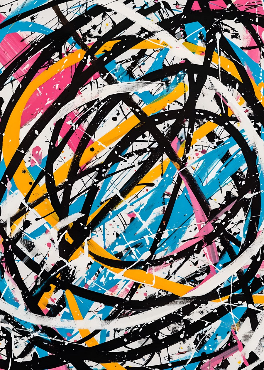 Energetic strokes of black, blue, yellow, and pink converge in a burst of chaotic beauty and raw expression.