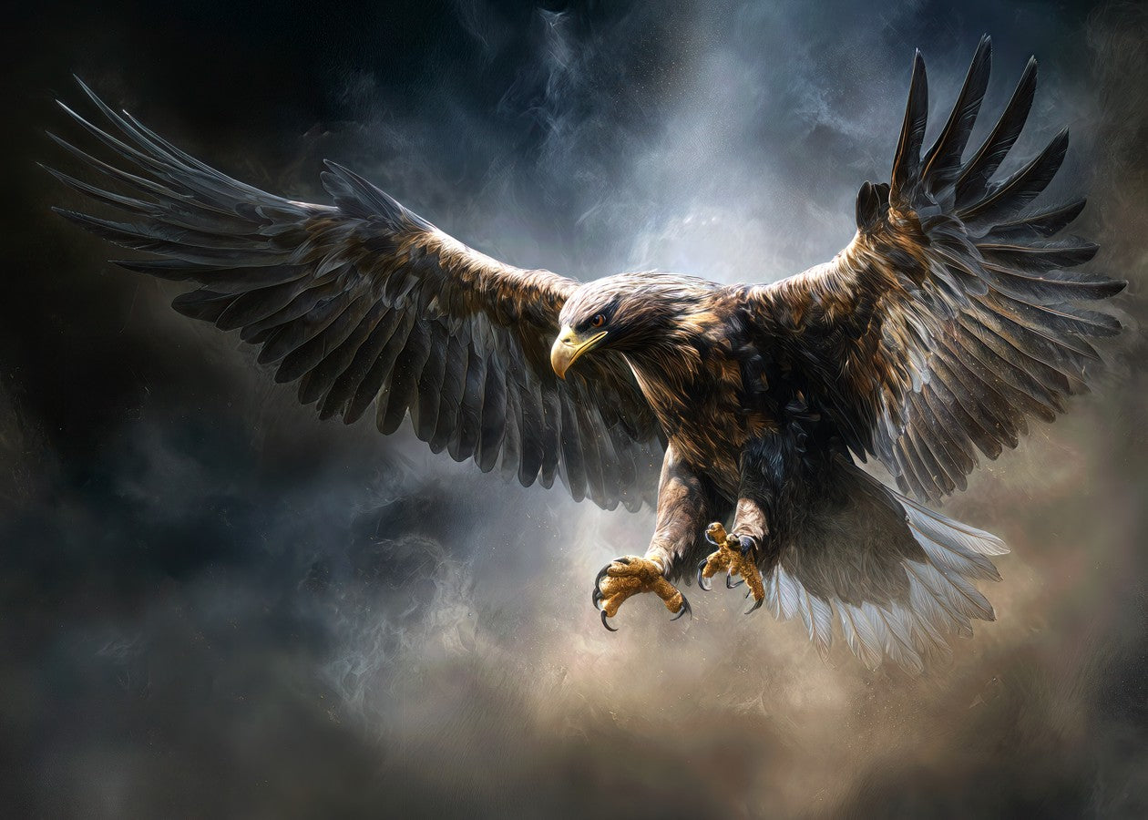 Majestic Eagle Soaring Through Stormy Skies Over a Dramatic Landscape at Twilight
