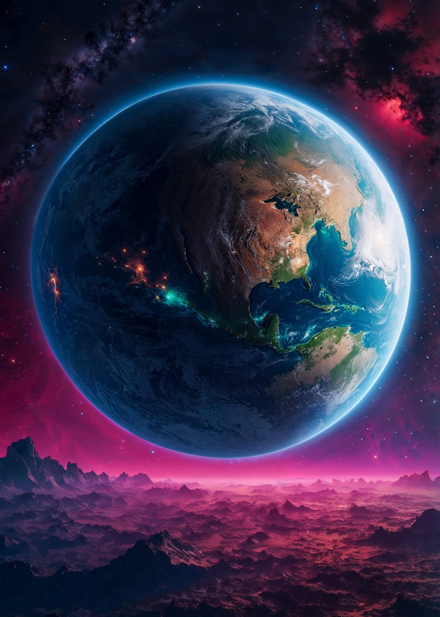 The image depicts a stunning view of Earth from space, with the planet's continents and oceans clearly visible.