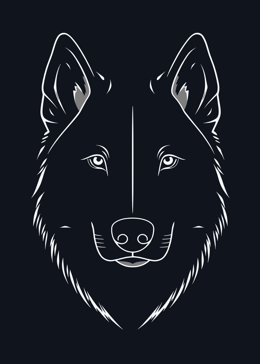 A monochrome illustration of a wolf’s face rendered in fine white and gray lines on a dark background.