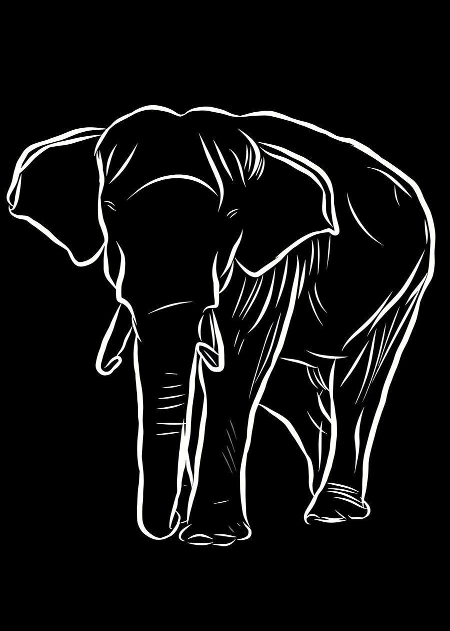 A simple, white line art illustration of an elephant with a black background. The minimalistic approach accentuates the elephant’s striking.