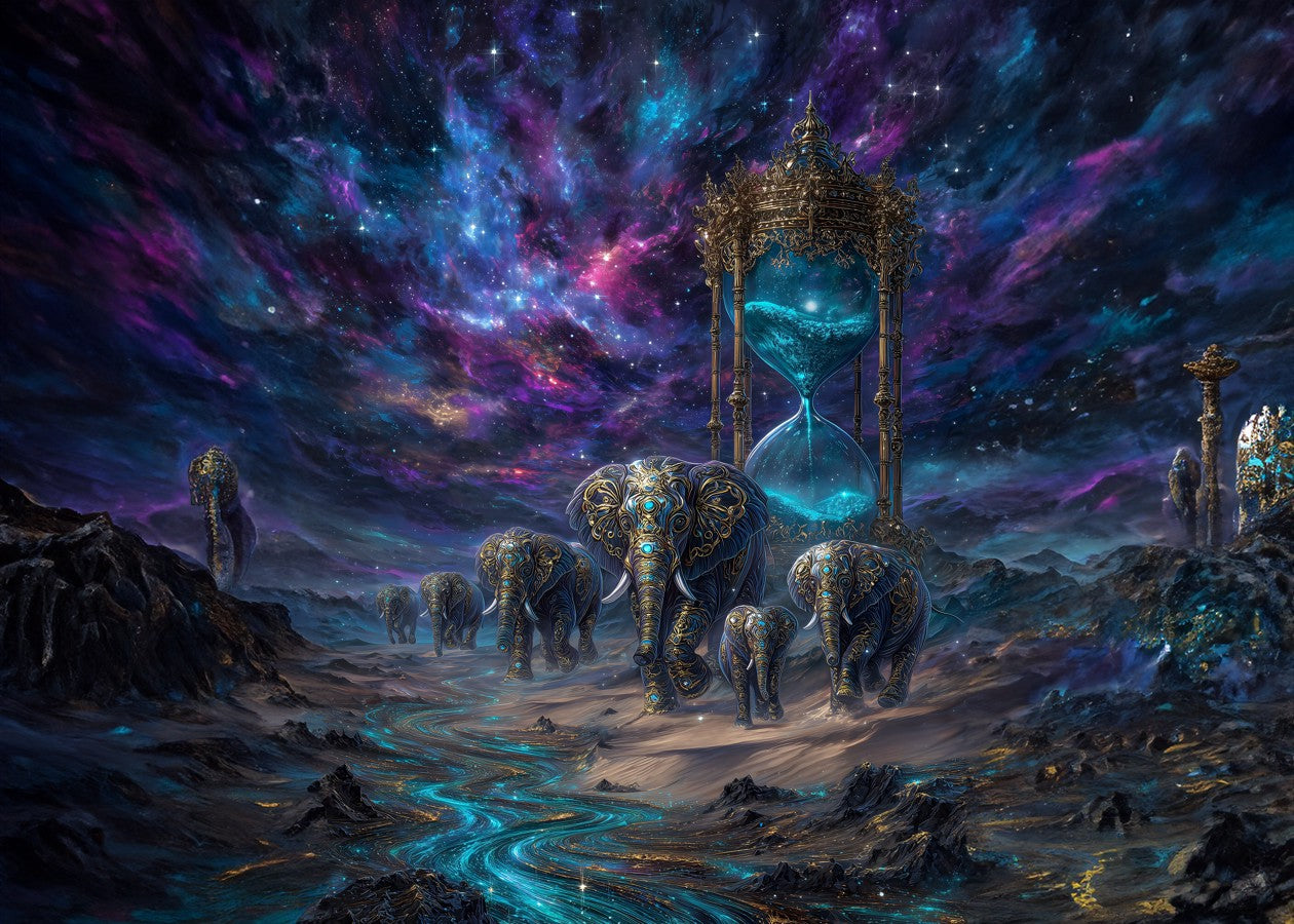 Mystical elephants wander under a cosmic sky with a celestial hourglass.