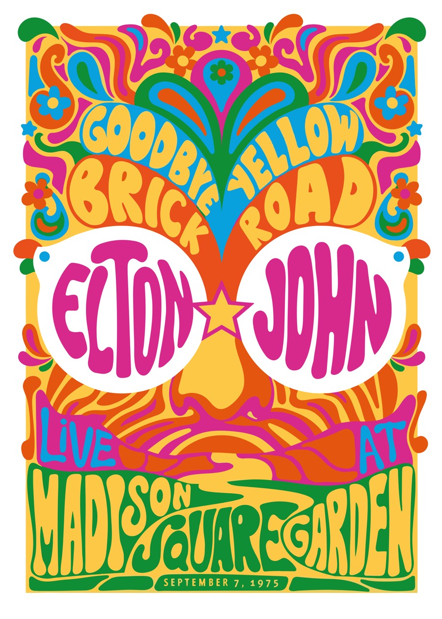 This vibrant poster pays tribute to Elton John's iconic "Goodbye Yellow Brick Road" concert at Madison Square Garden on September 7, 1975.