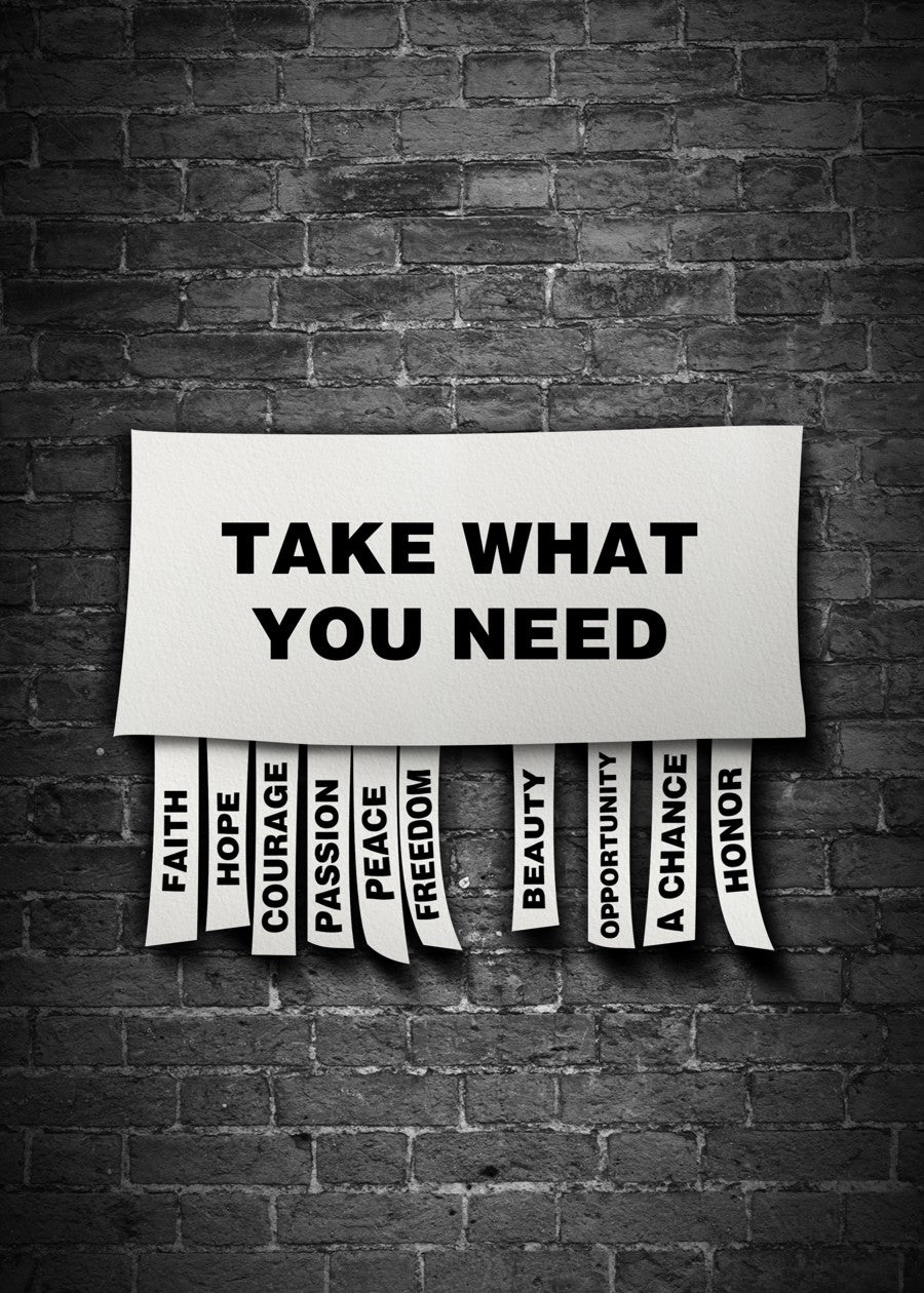 A tear-off flyer offering essentials for the soul: Faith, Hope, Courage, Peace, Freedom, and more. Grab the inspiration you require today.