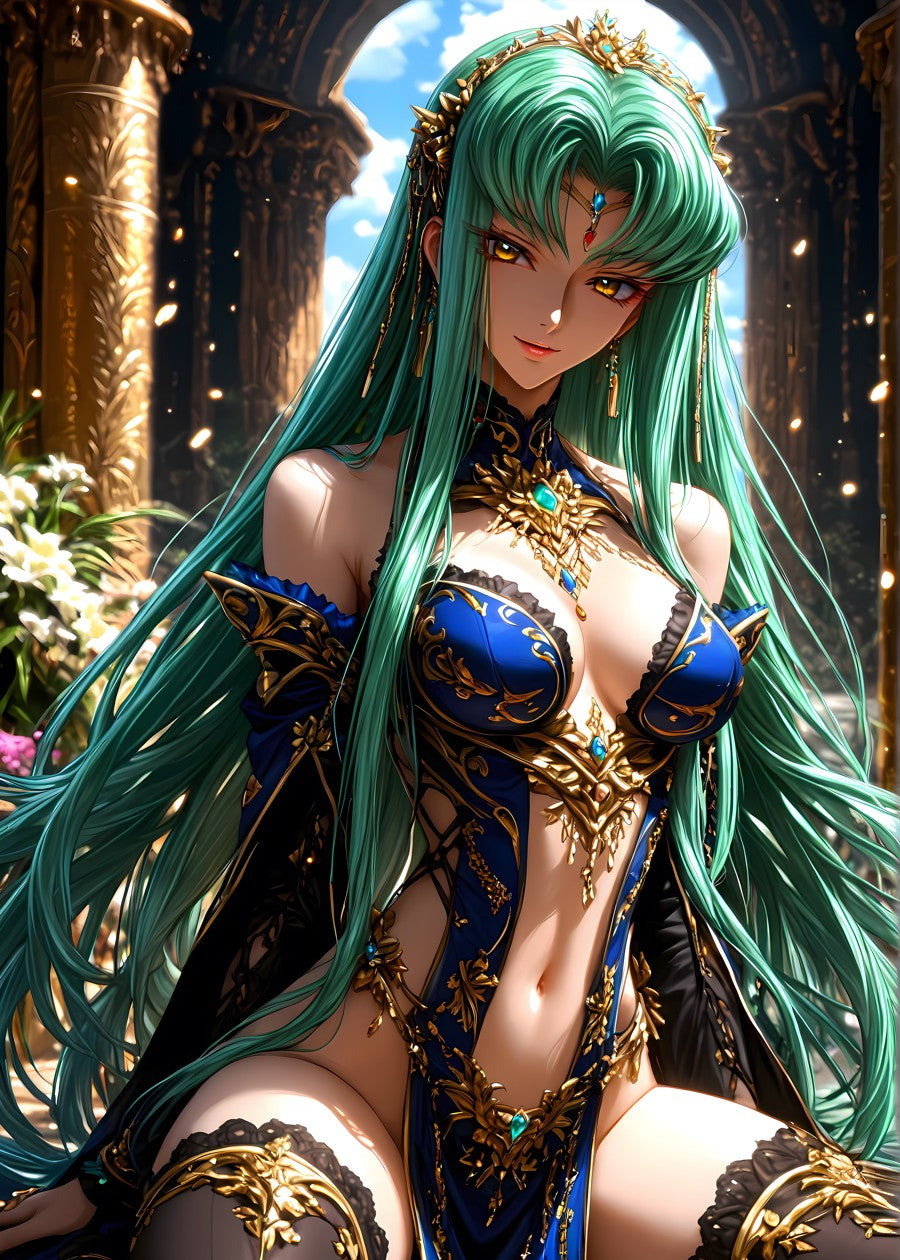A mystical figure adorned in intricate golden and royal blue armor.