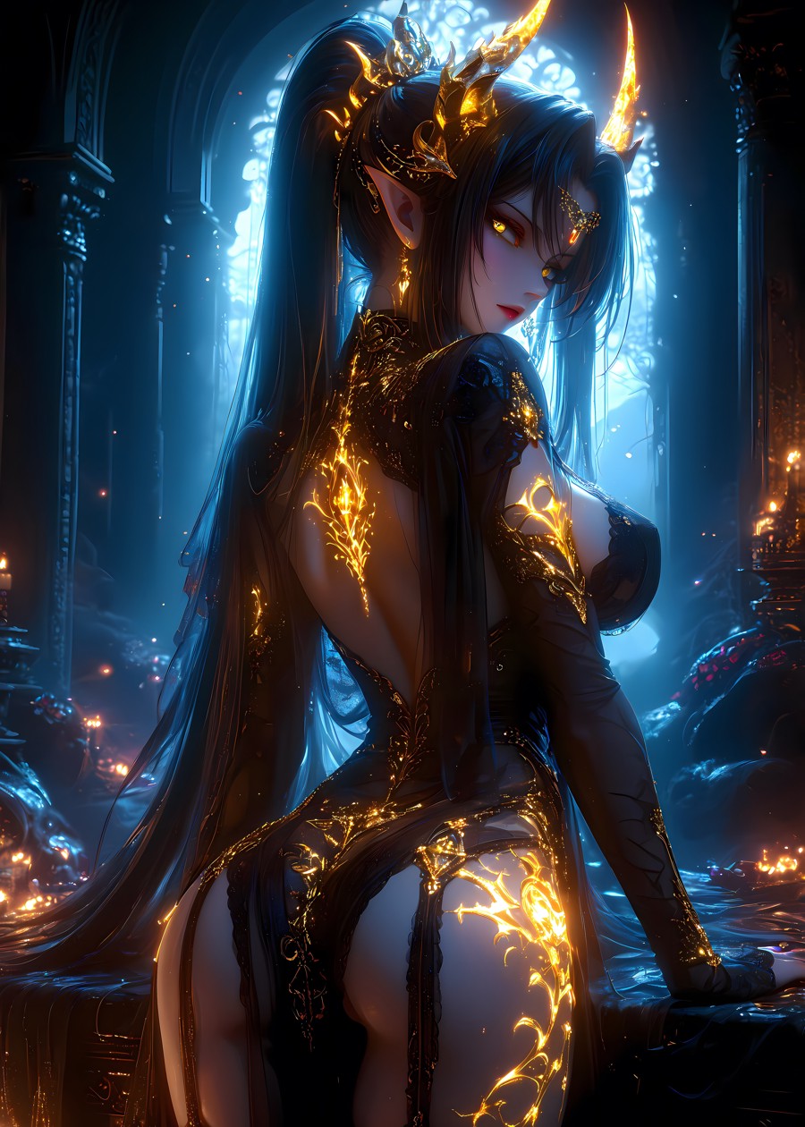 A mystical figure adorned in glowing, golden runes amidst a dimly lit, ethereal chamber.