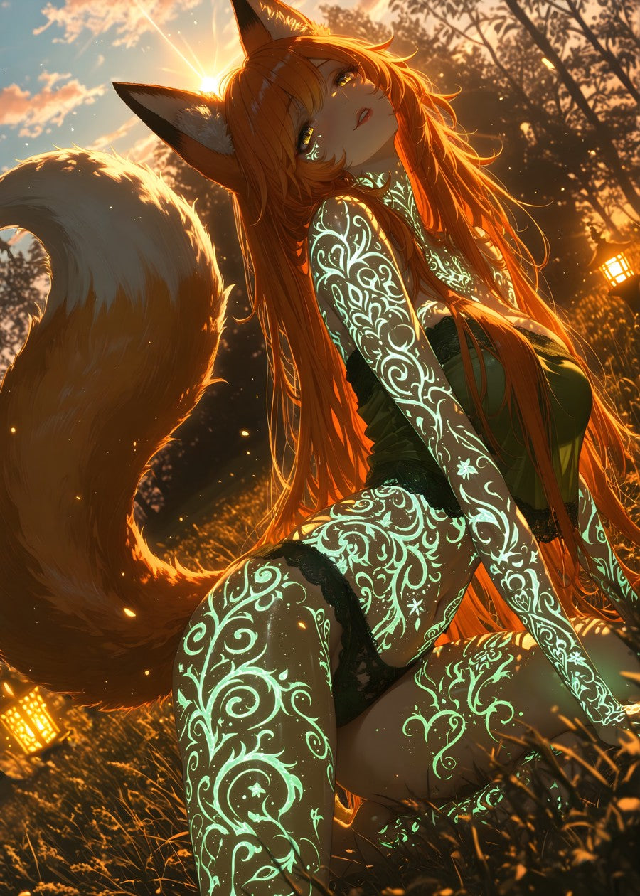 A mystical fox spirit with glowing patterns in a sunset meadow, radiating magical energy.