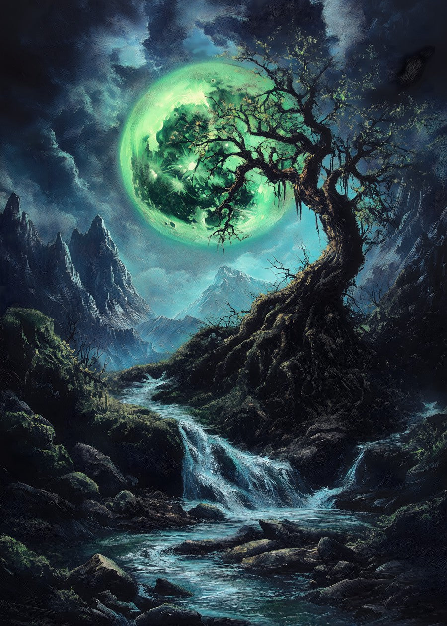 A vibrant green orb illuminates the mystical landscape beneath a twisted tree.