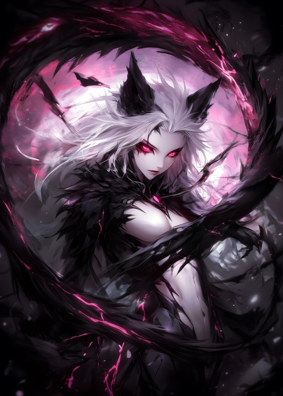A mysterious figure with piercing eyes emerges from swirling dark and pink energies.