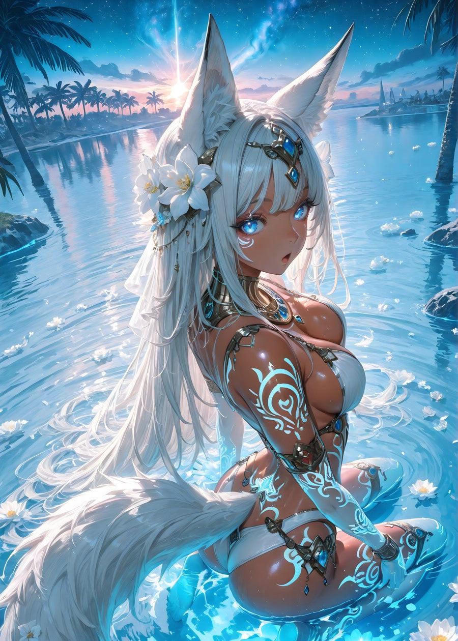 A mystical figure with glowing patterns basks in an ocean sunset.
