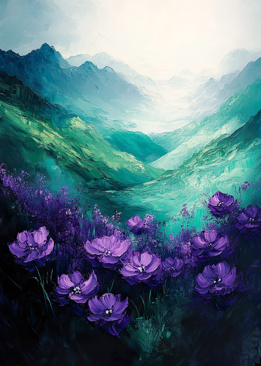 Purple blooms adorn a stunning valley, bathed in ethereal light.
