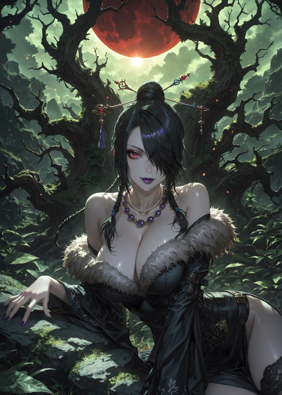 Mysterious figure beneath a blood-red moon, amidst twisted trees.