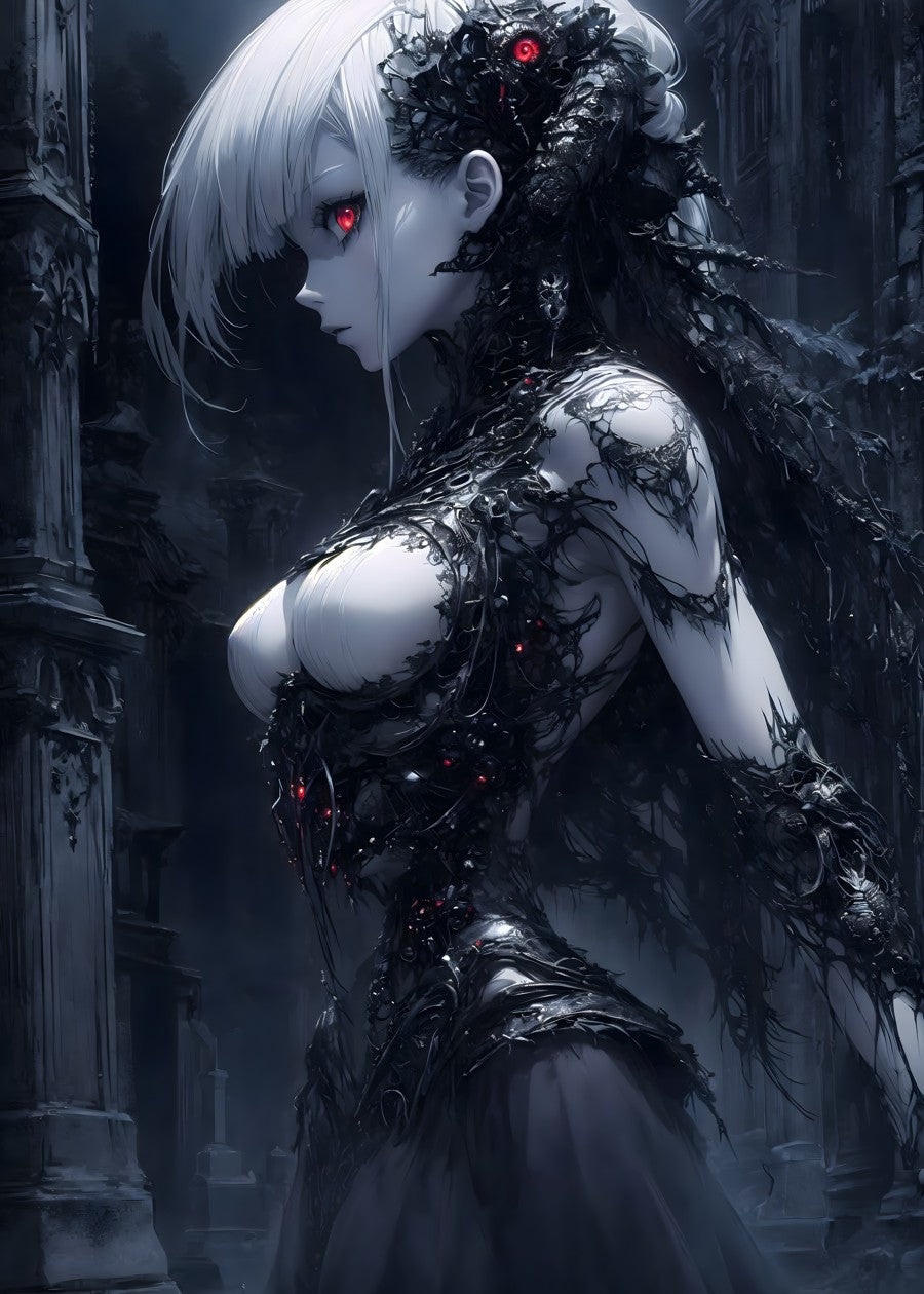 A mysterious figure stands in darkness, adorned with intricate, dark attire.