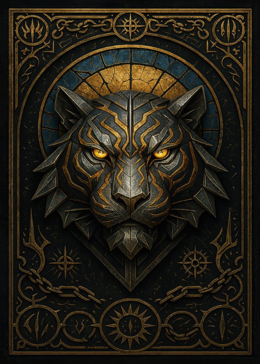 A powerful tiger with glowing stripes roars in ancient armor, chained within a gothic baroque frame. This fantasy beast radiates rage.