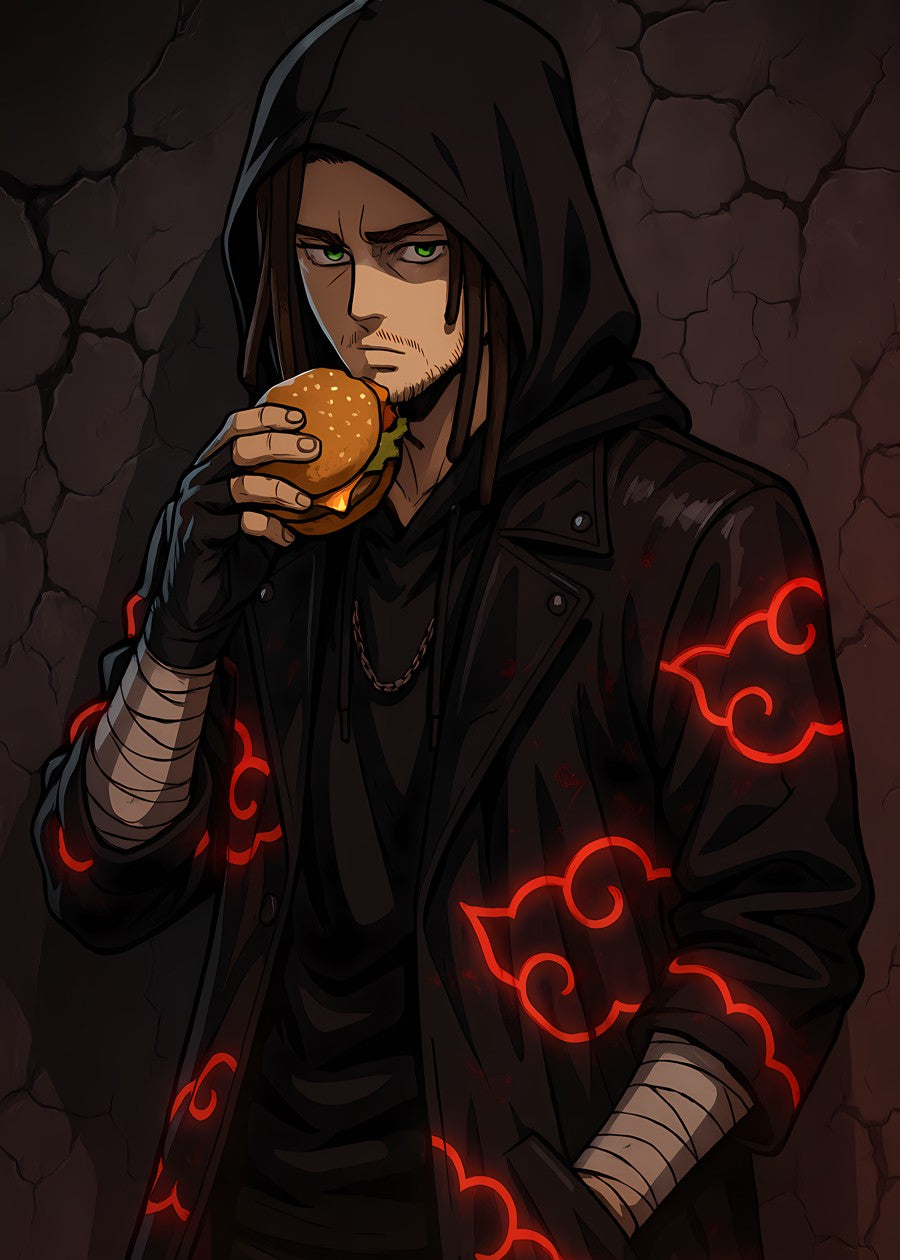 Eren Yeager in a long hooded Akatsuki coat holding a burger. Dark urban anime style.