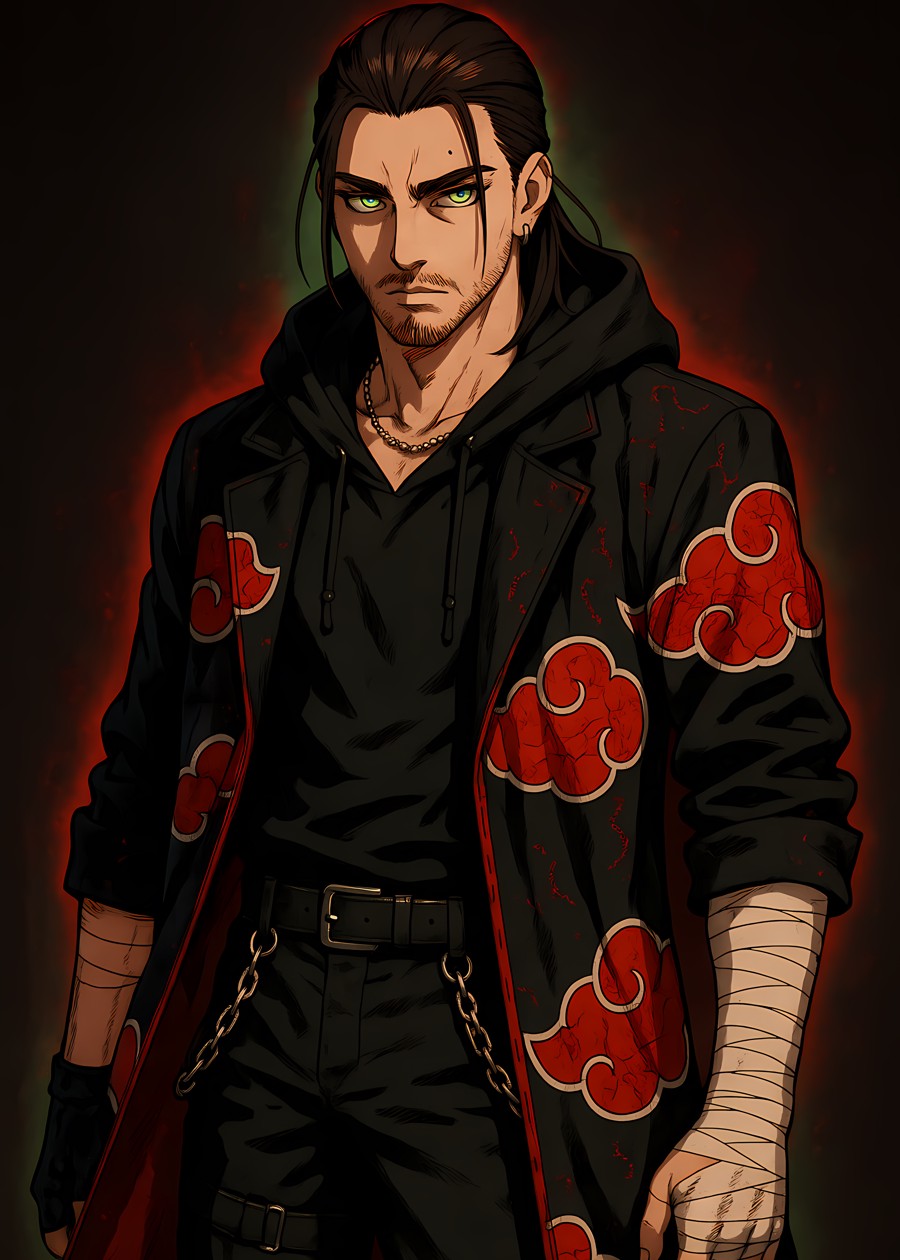 Eren Yeager reborn in Akatsuki style — calm rage behind green eyes, dark chains, and the red clouds of rebellion.