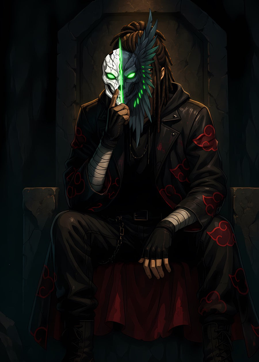 Eren Yeager sitting on a throne making a silence gesture behind a mask. Dark and mysterious.