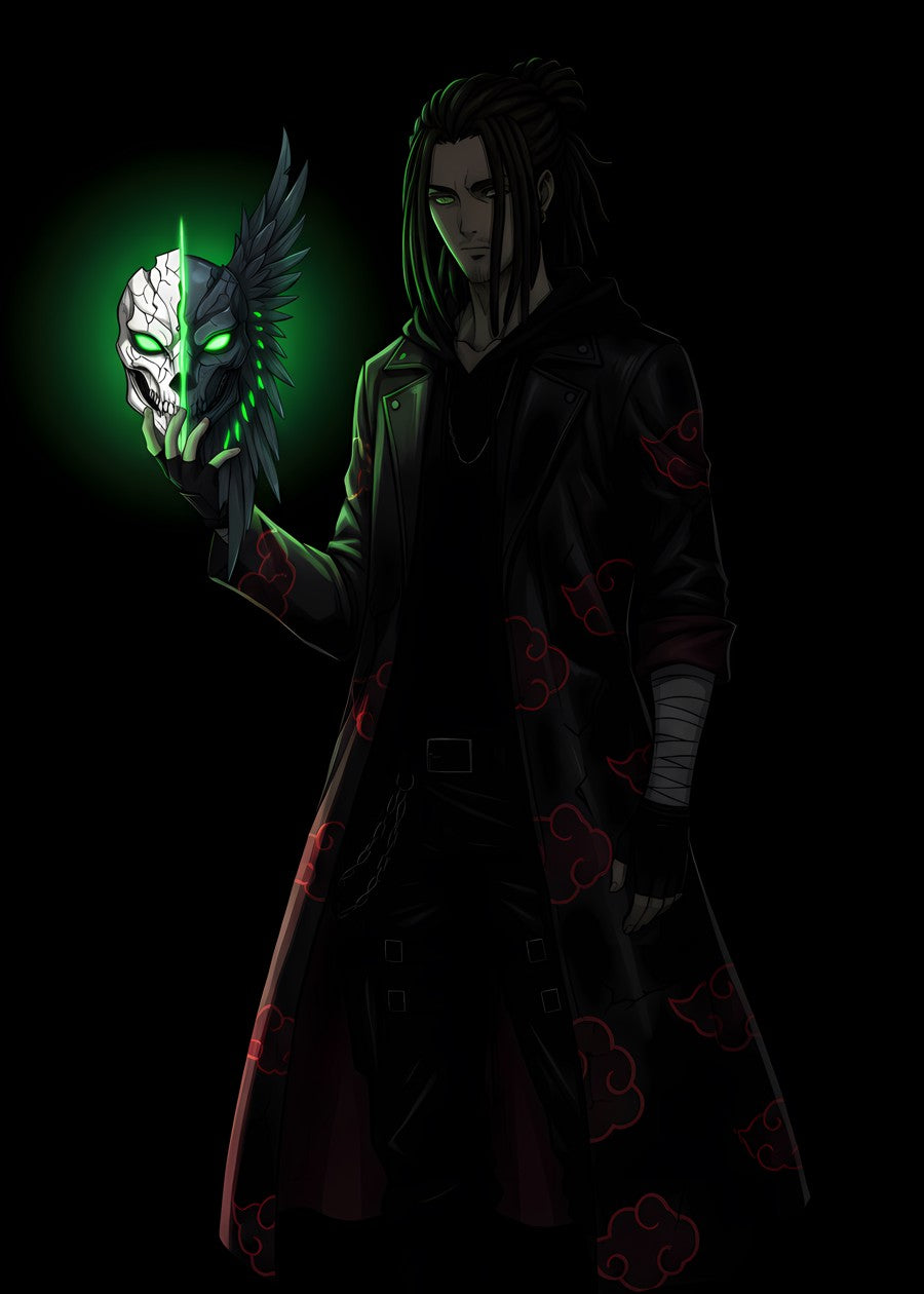 Eren Yeager standing in the dark holding a glowing mask. Green eyes and Akatsuki vibes.