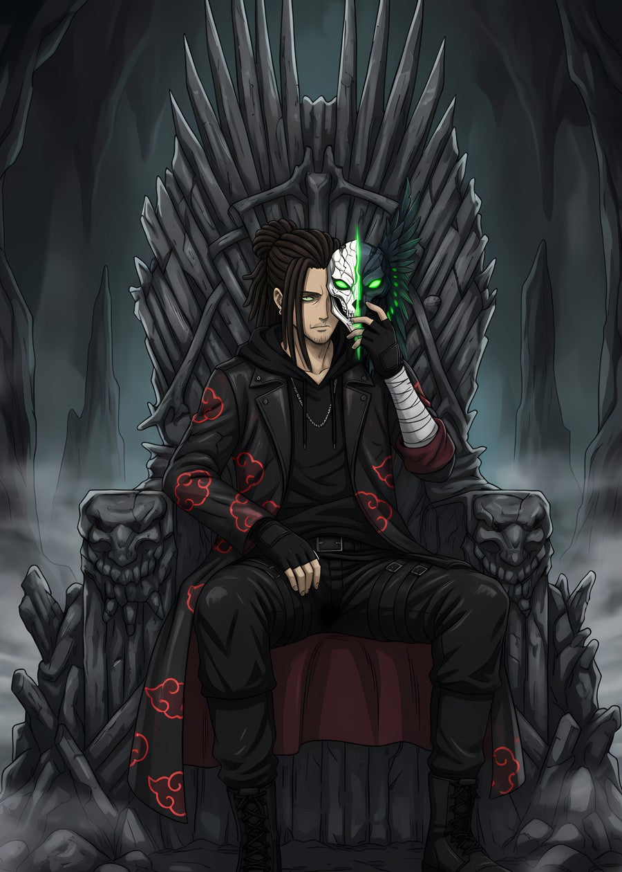 Eren Yeager on a throne covering half his face with a glowing hollow mask.