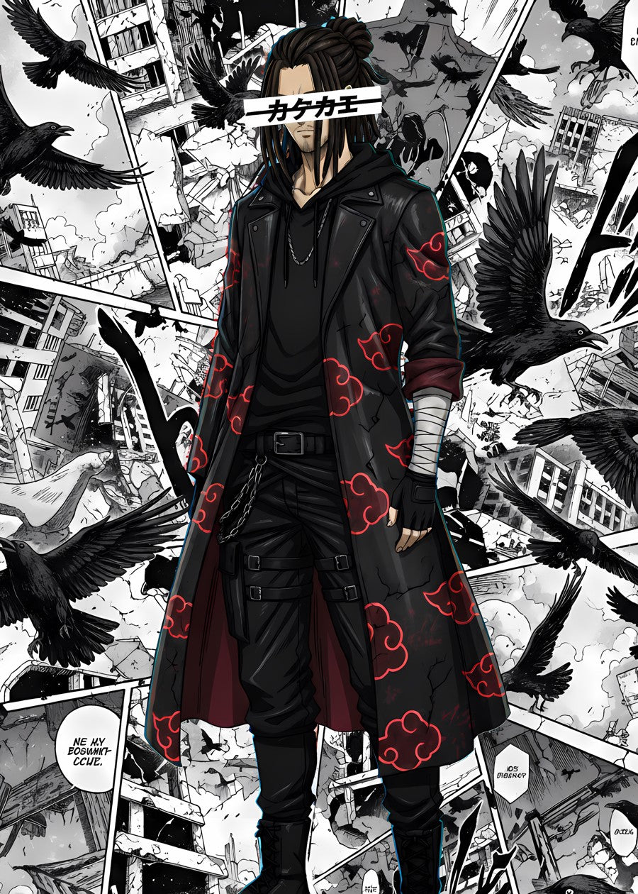Eren Yeager in a manga collage style with crows and urban aesthetic elements.