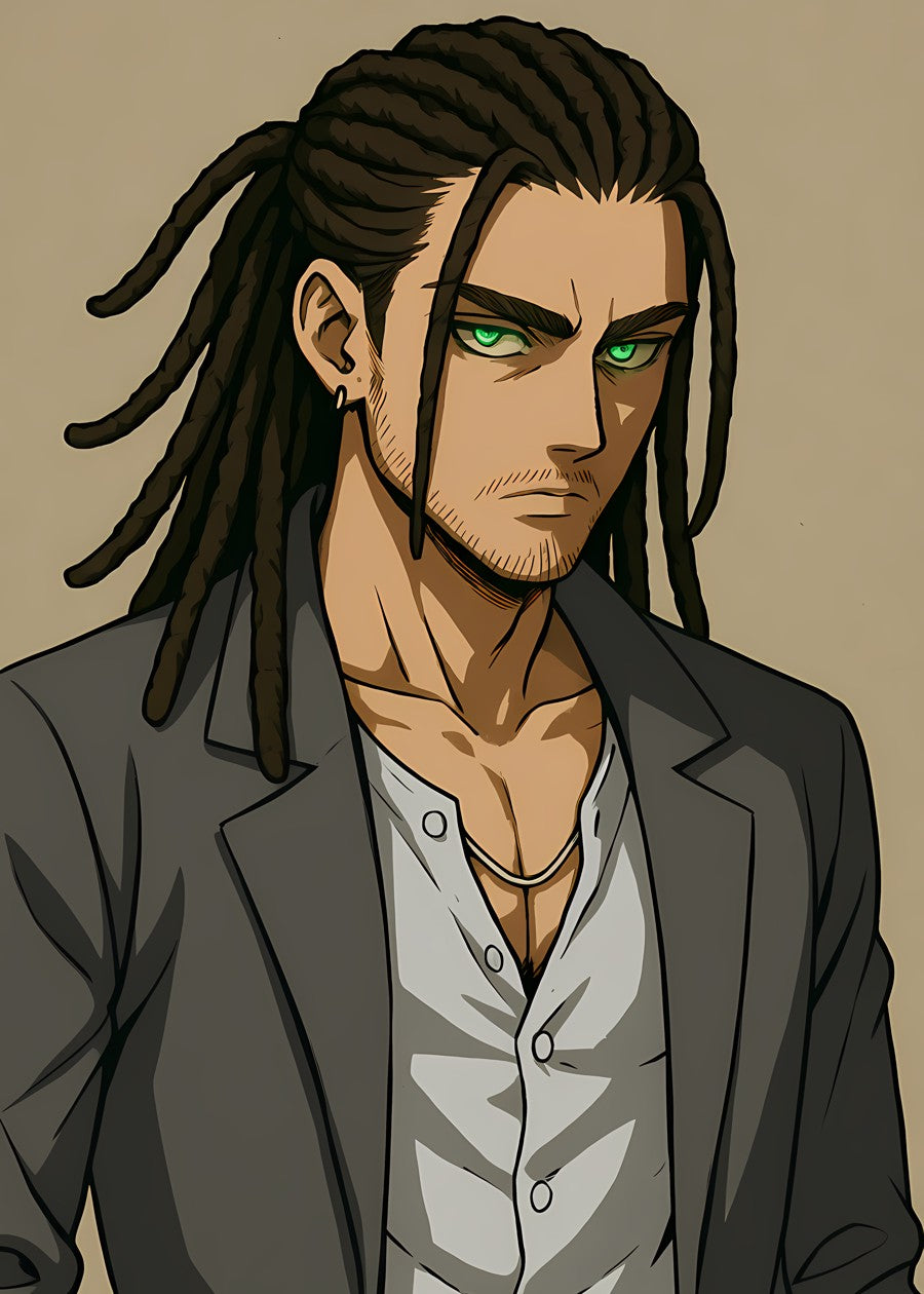 Eren Yeager reimagined in modern form — dreadlocks flowing, calm yet intense gaze, and minimalist fashion blending class and rebellion.