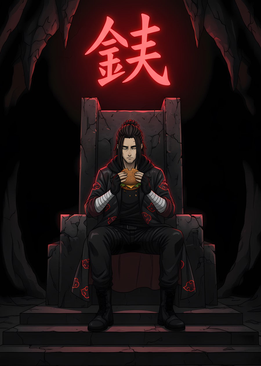 Eren Yeager eating a burger on a throne under a glowing red neon symbol.