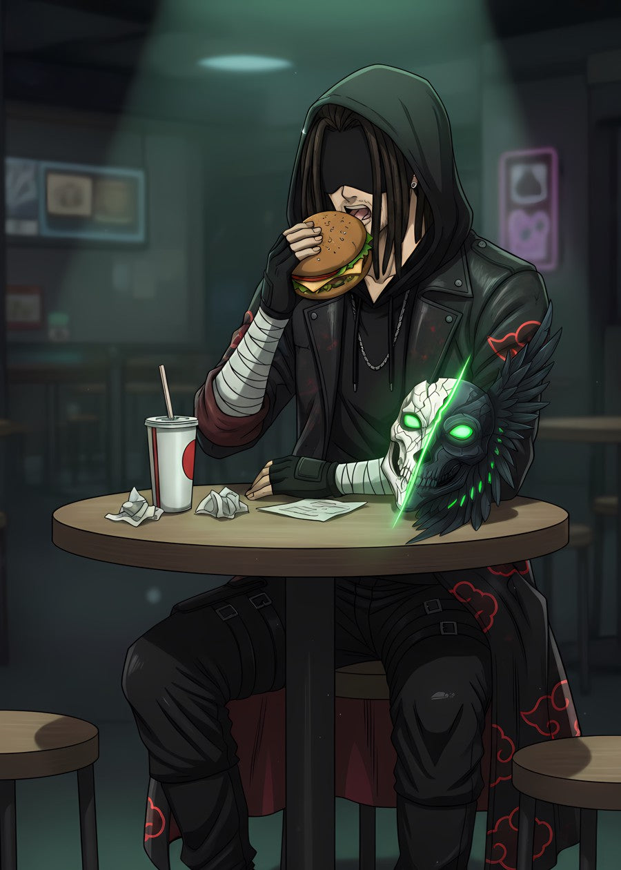Eren Yeager eating at a dark diner with glowing green eyes and a mask on the table.