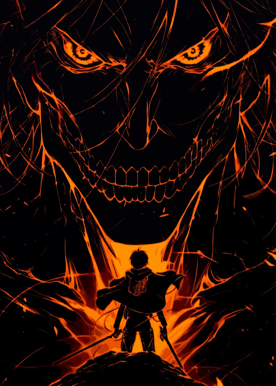Eren Yeager, in the midst of battle, transforms into a Titan for the first time.